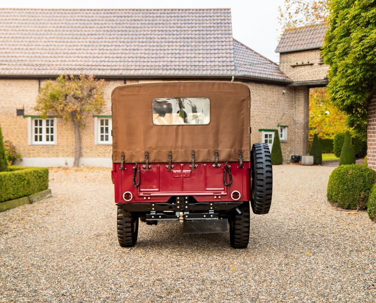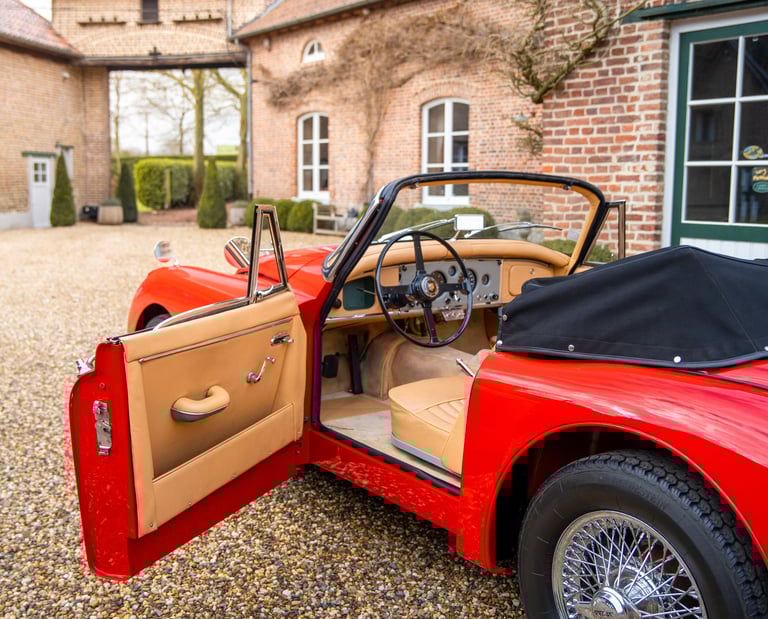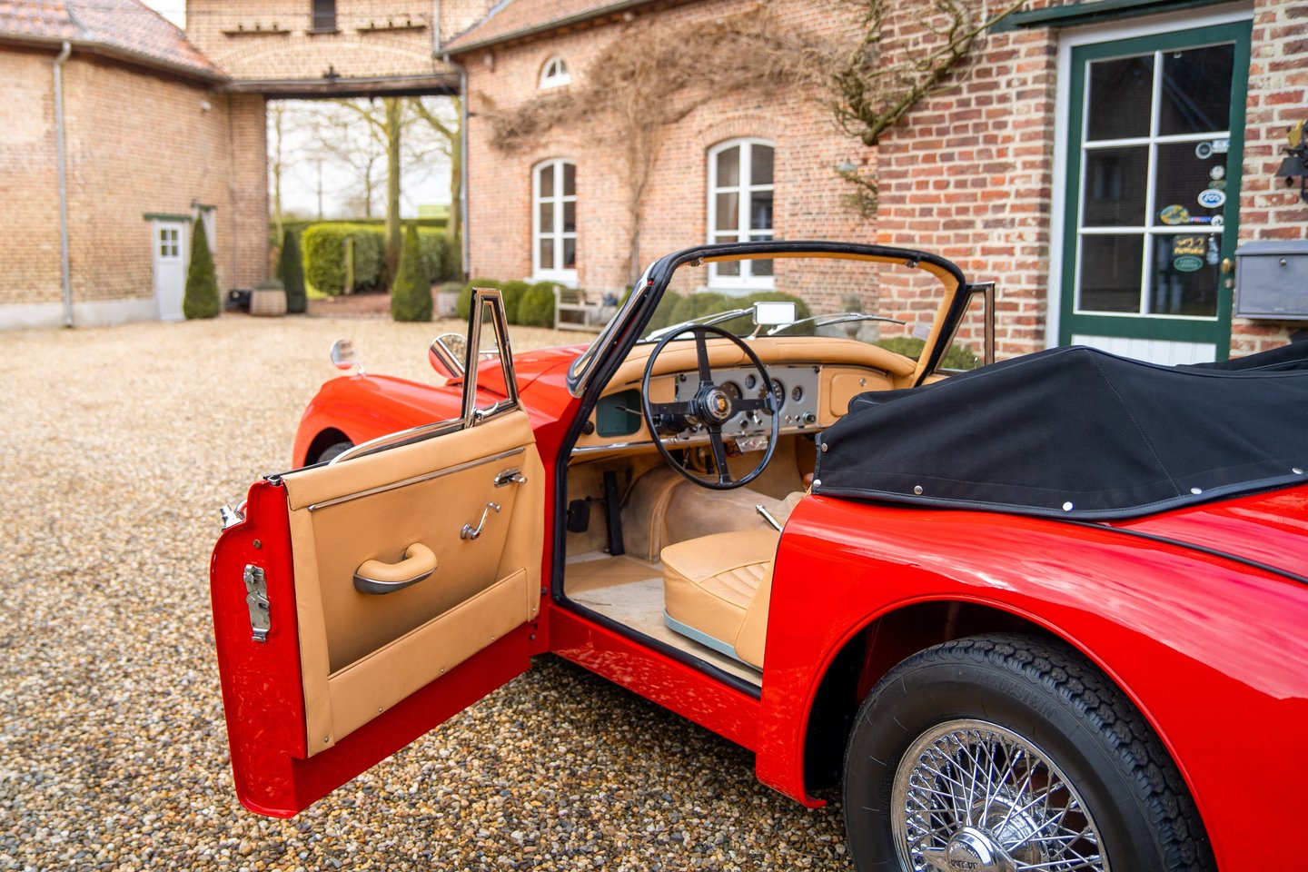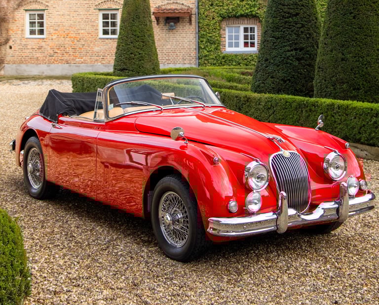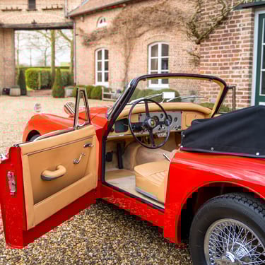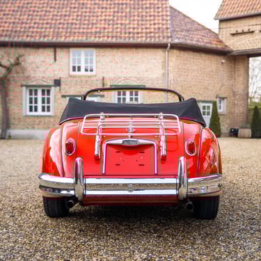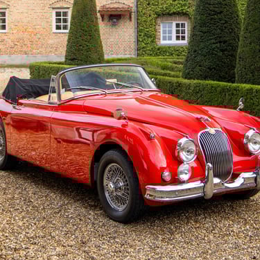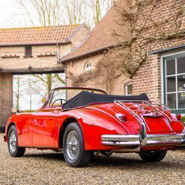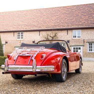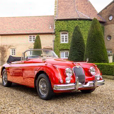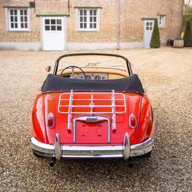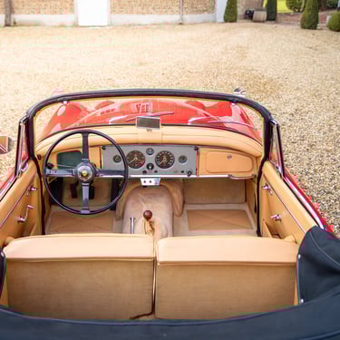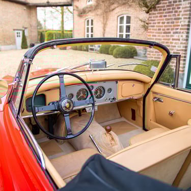 Vendue neuve aux Etats-Unis en décembre 1958, cette voiture s'est retrouvée en Europe il y a quelques années. Un Français l'a achetée et importée en France où elle a été restaurée. Cette restauration a été effectuée selon des standards très élevés et quelques modifications ont été apportées à cette occasion. Livrée à l'origine à un concessionnaire new-yorkais dans une couleur extérieure crème avec un intérieur biscuit, le Français a fait repeindre la voiture dans une couleur rouge correcte pour l'époque. Le choix de l'intérieur biscuit a été préservé. Une nouvelle capote en mohair noir, avec housse de capote, a également été installée à l'époque. En ce qui concerne l'état de la voiture, les photos parlent d'elles-mêmes ! Techniquement, la voiture a été entièrement reconstruite et la boîte de vitesses automatique d'origine a été remplacée par une boîte de vitesses manuelle à 5 rapports. Les freins ont été améliorés et la suspension a été soignée. Les freins ont été améliorés avec un maître servo-frein. Un jeu d'amortisseurs spaxs réglables a été installé pour améliorer la tenue de route. 3 carburateurs SU avec des tuyaux courts donnent le bon mélange et le bon son au moteur à double arbre à cames. Un échappement en acier inoxydable termine le tout. La voiture fonctionne et roule parfaitement et se comporte extrêmement bien en toutes circonstances, qu'il s'agisse de se promener ou de participer à un rallye. Pour ce qui est de l'intérieur de la voiture, l'intérieur en cuir est très beau et a toujours été très bien entretenu. Le tableau de bord est équipé du cadran Smith d'origine. Tous les chromes sont en bon état. Les roues chroom sont équipées de nouveaux pneus Vredestein Sprint classic de taille 205/70-15. En outre, la voiture a été équipée d'un porte-bagages chroom, de feux de route Lucas, d'un nouveau faisceau électrique, d'une roue de secours chromée, etc. La voiture est toujours immatriculée en France et est livrée avec son certificat Jagaur Heritage trust.