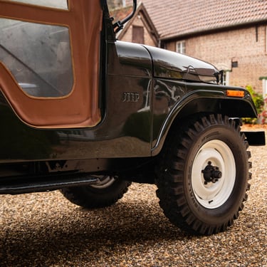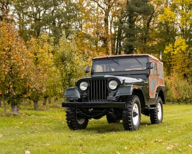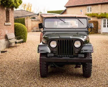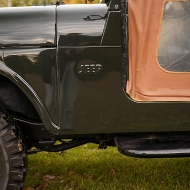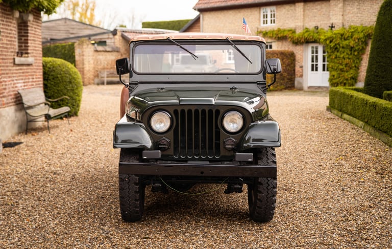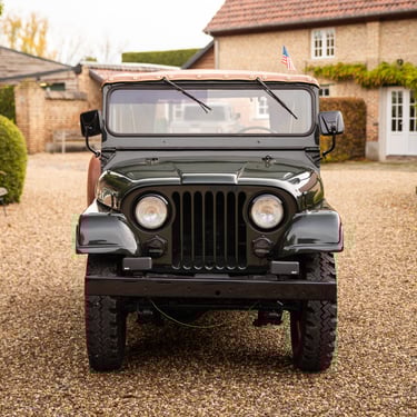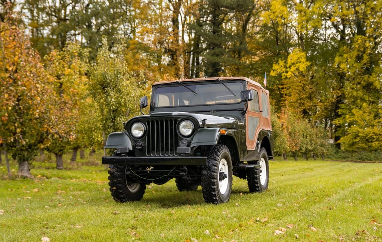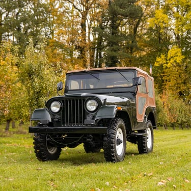 Jeep CJ5 en très bon état, produite sous la propriété de Kaiser. Ce modèle est équipé du moteur Hurricane 4 cylindres de 2,2 litres d'origine et de la transmission à 3 vitesses correspondante. La carrosserie est en bon état et ne présente aucune trace de rouille. La couleur vert foncé lui donne un air très cool.
